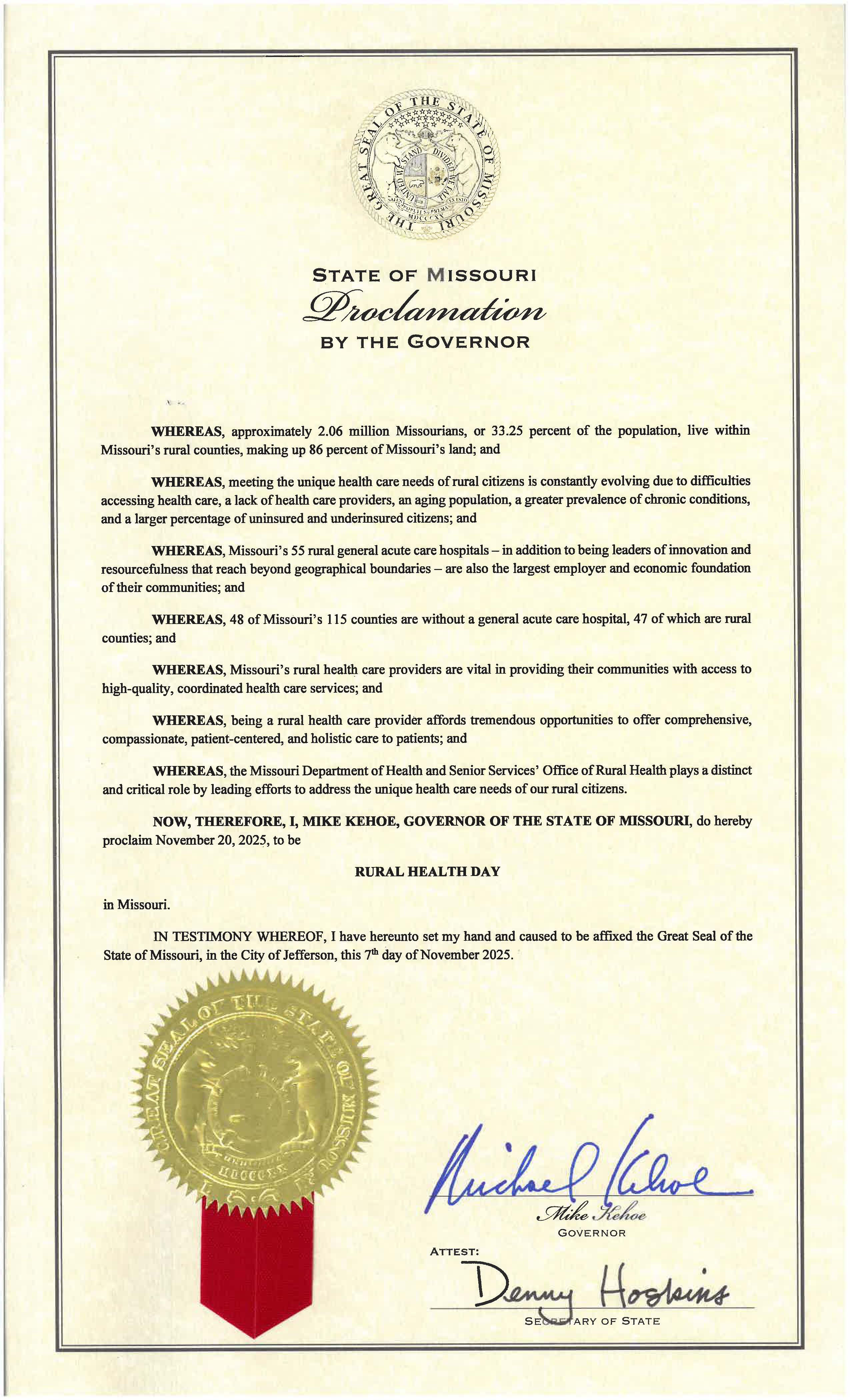 Governor Kehoe proclaimed Nov. 20, 2025 to be Rural Health Day.